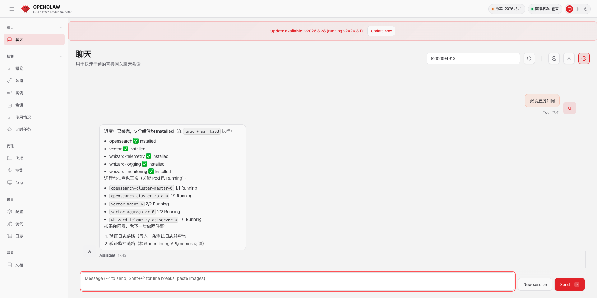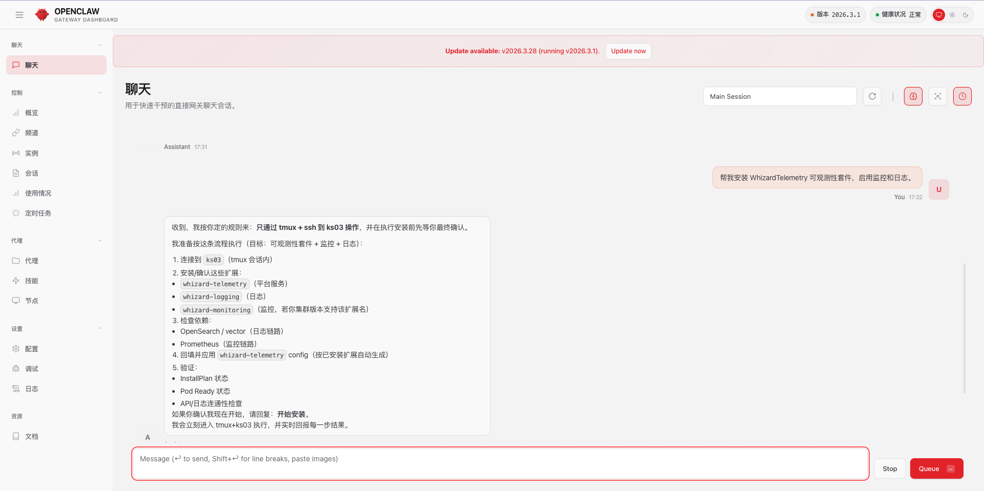 | 安装扩展组件 | 进入「扩展市场」→ 选组件 → 填写配置表单 → 等待安装 | 直接对话:「帮我安装 WhizardTelemetry」→ AI 生成正确的 InstallPlan YAML,kubectl apply 即完成 |