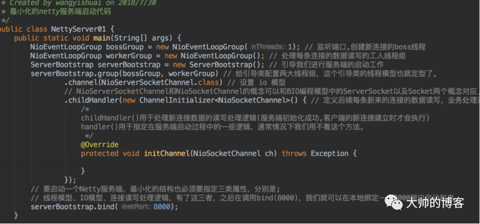 1、首先ServerBootstrap的init方法为服务端Channel的pipeline添加了一个ChannelInitializer,在该类实现的void initChannel(Channel ch)方法里先将用户代码里配置的服务端的handler添加,前面我也说过,这个服务端的handler配置一般很少用到(即.handler() API),常用的主要是给客户端配置handler,即.childHandler()