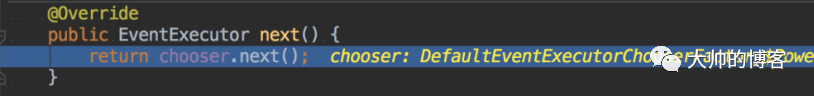 最后进入到父类io/netty/util/concurrent/MultithreadEventExecutorGroup类,看到这里就很熟悉了,会进入到前面分析过的NioEventLoopGroup的线程选择器。