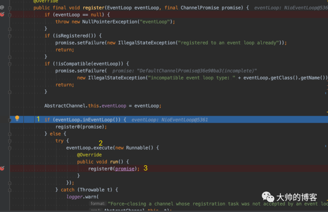 1、首先对当前客户端的I/O线程以及Channel做校验,然后在黄色1处,判断当前线程是不是NIO线程,显然这里是false,因为虽然此时已经选择了一个客户端NIO线程,但是该NIO线程还没有启动,整个注册逻辑还是运行在用户线程下,我的demo是main线程,如下佐证,故1这里判断失败,接下来执行else里的代码,将真正的注册逻辑委托给刚刚启动的客户端的NIO线程异步执行,这样做也能保证线程安全。