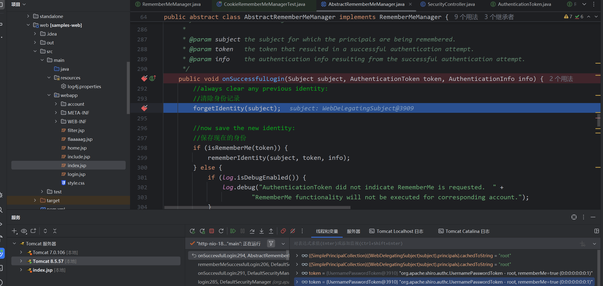 搜索关键处login,经分析我们在onSuccessfulLogin处打上断点,此为RememberMeManager抽象子类的一个方法
