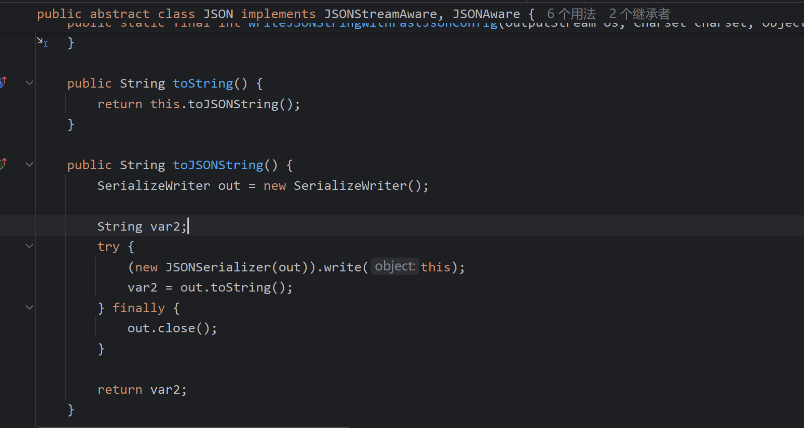 最后看看toString方法是如何调用所有getter方法的,可以看到使用了ASMSerializer写入,这个类是运行时动态生成的所有看不到代码,为了提升性能,使用heapdump查看代码,使代码保持运行(如尾部加while(true))