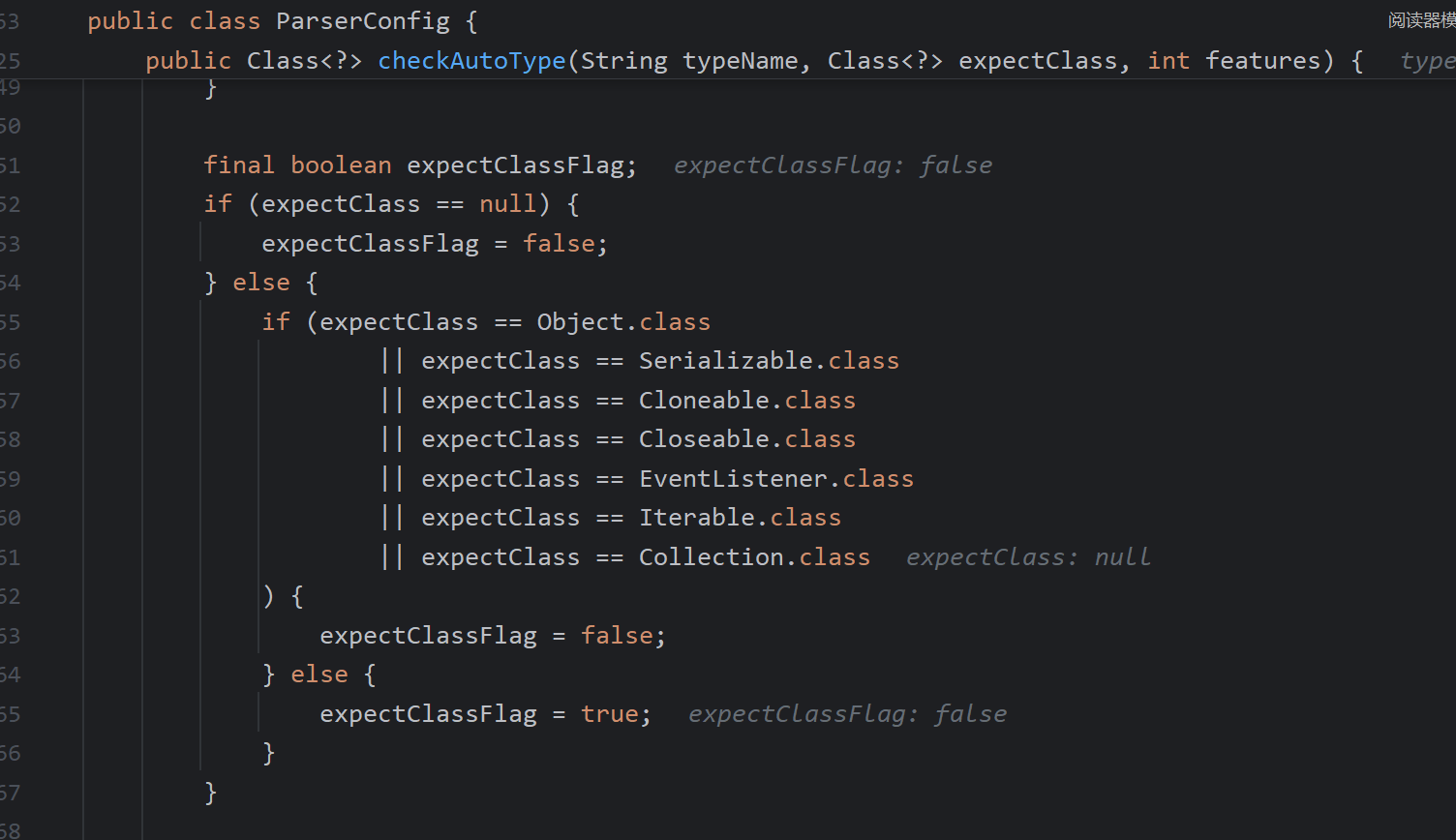 调用checkAutoType检查,其在黑名单中。那我们如何绕过呢,不进入到这里的resolveClass函数
