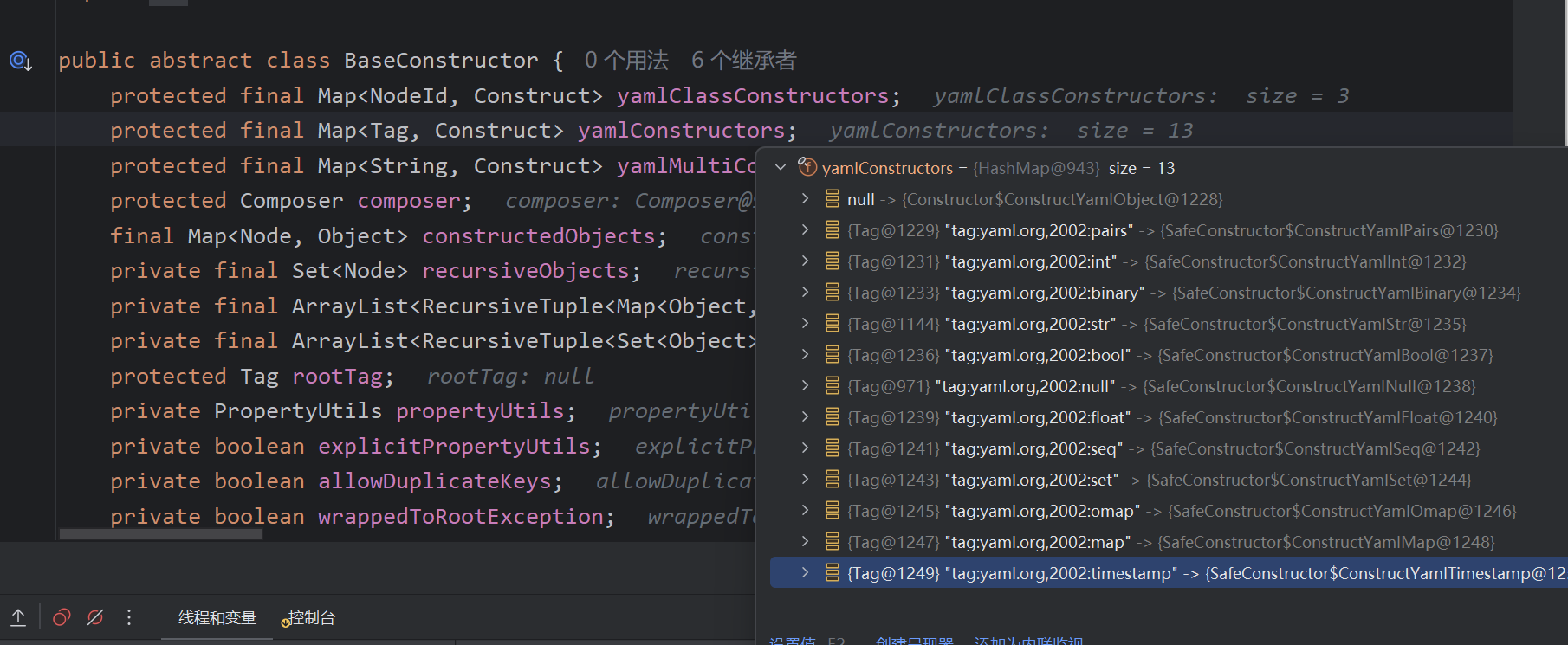 通过yamlConstructors查找标签头,但这里的Person自然是找不到的。然后yamlMultiConstructors是开发者自定义的,自然也是没有的,最后使用了null对应的构造器,出函数,调用constructor.construct