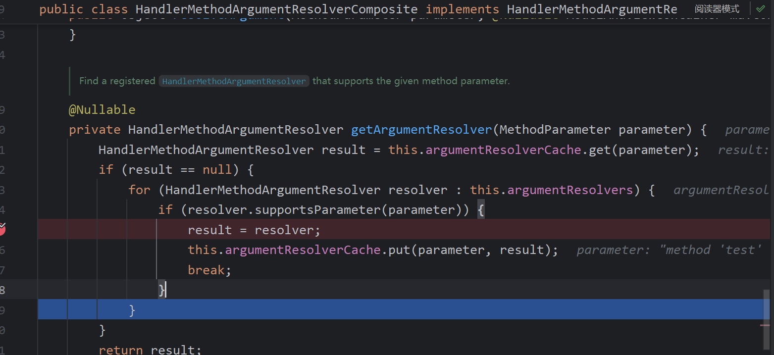 invokeAndHandle 中调用getArgumentResolver,其中会遍历解析参数解析器,找到支持的解析器