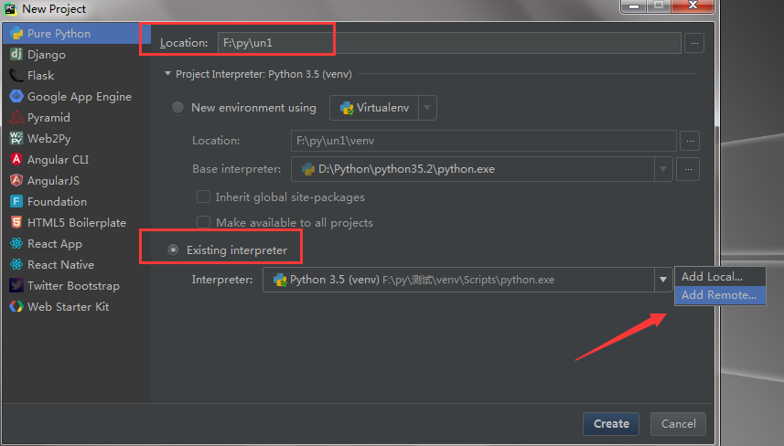 安装好pycharm > 新建一个项目 > 修改项目名 > 添加远程虚拟环境(点选 Add remote)