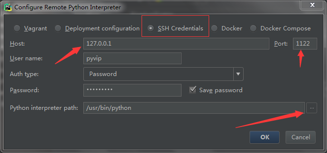 点击SSH > 输入HOST(根据所配置虚拟机的软件来填,virtualBox在NET模式下使用127.0.0.1) > 设置port(根据虚拟机上设置的主机端口名来定)> 配置python解释器路径(python interpreter path,即之前配置好的虚拟环境的路径)> 点击OK