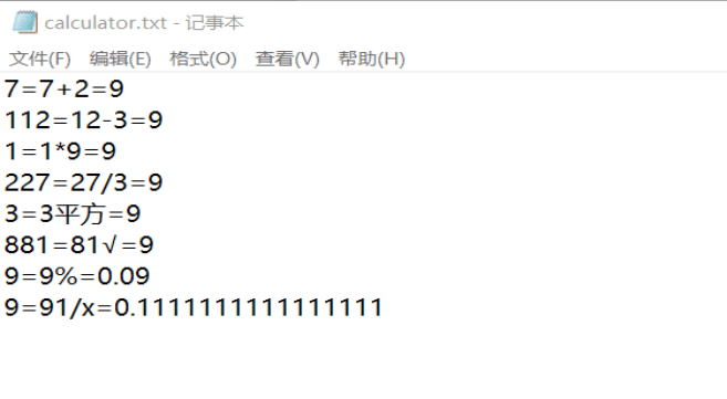 简易计算器模拟程序:仿照Windows计算器,编写一个具有GUI的计算器,能实现加、减、乘、除四则运算,平方、开方运算,倒数、百分号运算等。历次计算过程保存放入文件中,再显示回控制台便于查看计算过程。