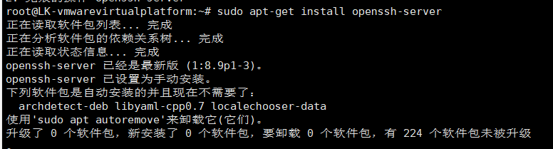 2、安装ssh服务,输入命令:#sudo apt-get install openssh-server,如果执行安装命令失败,则优先执行sudo apt-get update命令后再执行安装命令