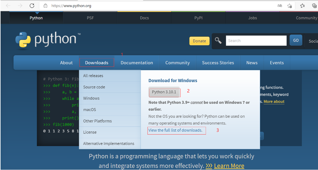 1、进入官网 python.org 。鼠标放在(1)Downloads上,可直接下载(2)Python 3.10或者进入(3)View the full list of downloads.选择其他版本。