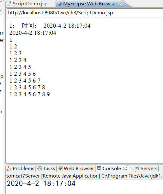 <% Date now=new Date(); %> <%=now.toLocaleString%> <% out.print(now.toLocaleString()); System.out.println(now.toLocaleString()); %>