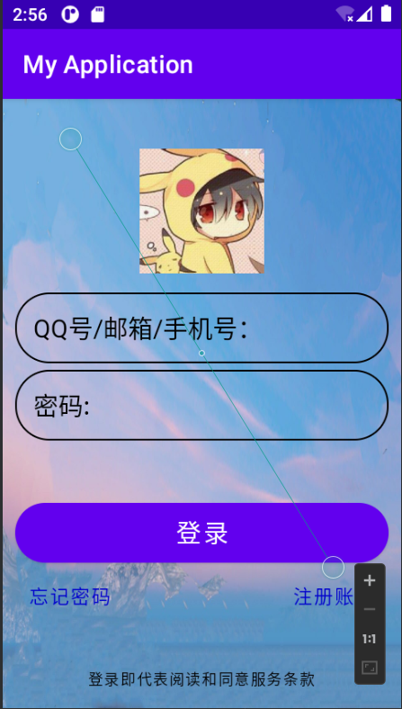 l version="1.0" encoding="utf-8"?> <RelativeLayout xmlns:android="http://schemas.android.com/apk/res/android" android:layout_width="match_parent" android:layout_height="match_parent" android:background="@drawable/b" android:orientation="vertical"> <!-- /*垂直分布*/--> <!-- 头--> <ImageView android:id="@+id/iv" android:layout_width="100dp" android:layout_height="100dp" android:layout_centerHorizontal="true" android:layout_marginTop="40dp" android:background="@drawable/a" /> <LinearLayout android:id="@+id/l_number" android:layout_width="match_parent" android:layout_height="wrap_content" android:layout_below="@id/iv" android:layout_centerHorizontal="true" android:layout_marginBottom="5dp" android:layout_marginLeft="10dp" android:layout_marginRight="10dp" android:layout_marginTop="15dp" android:background="@drawable/c"> <TextView android:id="@+id/tv_number" android:layout_width="wrap_content" android:layout_height="wrap_content" android:padding="10dp" android:text="QQ号/邮箱/手机号:" android:textColor="#000" android:textSize="20sp"/> <EditText android:id="@+id/et_number" android:layout_width="match_parent" android:layout_height="wrap_content" android:layout_marginLeft="5dp" android:background="@null" android:padding="10dp"/> </LinearLayout> <LinearLayout android:id="@+id/l_password" android:layout_width="match_parent" android:layout_height="wrap_content" android:layout_below="@id/l_number" android:layout_centerHorizontal="true" android:layout_marginLeft="10dp" android:layout_marginRight="10dp" android:background="@drawable/c"> <TextView android:id="@+id/tv_password" android:layout_width="wrap_content" android:layout_height="wrap_content" android:padding="10dp" android:text="密码:" android:textColor="#000" android:textSize="20sp"/> <EditText android:id="@+id/et_password" android:layout_width="match_parent" android:layout_height="wrap_content" android:layout_marginLeft="5dp" android:layout_toRightOf="@id/tv_password" android:background="@null" android:inputType="textPassword" android:padding="10dp" /> </LinearLayout> <Button android:id="@+id/btn_login" android:layout_width="match_parent" android:layout_height="wrap_content" android:layout_below="@id/l_password" android:layout_marginLeft="10dp" android:layout_marginTop="50dp" android:layout_marginRight="10dp" android:text="登录" android:textColor="#ffffff" android:textSize="20sp" android:background="@drawable/d"/> <Button android:id="@+id/btu_loginb" android:layout_width="wrap_content" android:layout_height="wrap_content" android:layout_below="@id/btn_login" android:layout_alignLeft="@id/btn_login" android:background="@drawable/e" android:padding="10dp" android:text="忘记密码" android:textColor="#0000CD" android:textSize="15sp"/> <Button android:id="@+id/btu_loginc" android:layout_width="wrap_content" android:layout_height="wrap_content" android:layout_below="@id/btn_login" android:layout_alignRight="@id/btn_login" android:background="@drawable/e" android:padding="10dp" android:text="注册账号" android:textColor="#0000CD" android:textSize="15sp" /> <TextView android:id="@+id/btu_logind" android:layout_width="wrap_content" android:layout_height="wrap_content" android:layout_centerHorizontal="true" android:layout_alignParentBottom="true" android:background="@drawable/e" android:padding="10dp" android:text="登录即代表阅读和同意服务条款" android:textColor="#000000" android:textSize="12sp" /> </RelativeLayout>