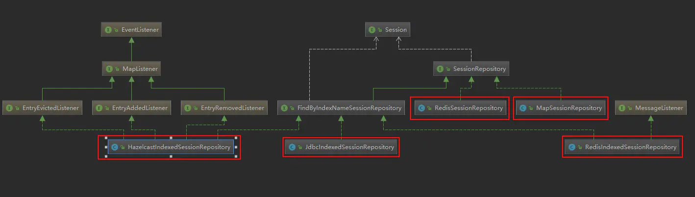 RedisIndexedSessionReponsitory:可发布事件的 redis 仓库,它还额外实现了MessageListener,这也意味着它会使用 redis 的键空间(你的 redis 必须要开启键空间的功能)。它会在 redis 上生成三条数据。一个是以 spring:session:sessions:33fdd1b6-b496-4b33-9f7d-df96679d32fe 的 hash;一个是用来记录 session 是否有效的 string;一个是用来对 redis 键空间补偿(因为键空间不是特别的靠谱(如果不访问键的话可能不会出发键空间),采用的方式是每分钟轮询(具体请看RedisSessionExpirationPolicy))的 Set,它的 key 是 spring:session:expirations:当前时间(秒和毫秒都是0)的下一分钟的时间戳,里面存储的是这一分钟内生成的 sessionId。还可以自定义序列化,默认时使用。具体可以看官方APIRedisSessionRepository:简单版的 redis session 方案,相较于 RedisIndexedSessionReponsitory 它没有实现MessageListener也不能发布事件,它在 redis 上只会生成一条数据。如果你不需要对键过期或删除做后续处理,你就可以使用这个存储方案。JdbcIndexedSessionRepository:使用 jdbc 作为外部存储,要先建表,速度也是一个问题,成本较高,不太推荐。HazelcastIndexedSessionRepository:使用 Hazelcast 作为外部存储。Hazelcast 是一个内存数据网格(IMDG),也是 kv 存储,但是国内好像用的比较少。这个真的蛮好用的,一个 jar 就可以部署。
