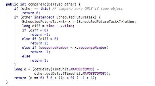 ScheduledThreadPoolExecutor会把待执行的任务放到工作队列DelayQueue中,DelayQueue封装了一个PriorityQueue,PriorityQueue会对队列中的ScheduledFutureTask进行排序,具体的排序算法实现如下: