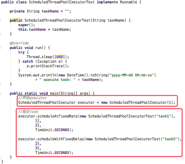 在开始分析源码具体实现之前,先给一个简单的ScheduledThreadPoolExecutor使用案例:
