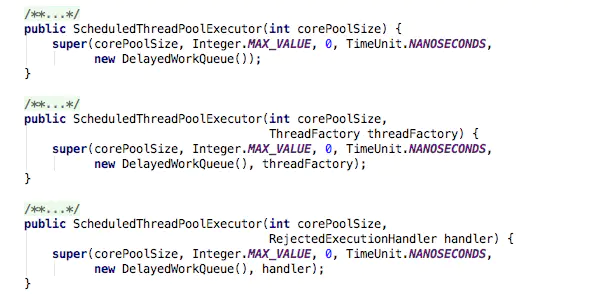 ScheduledThreadPoolExecutor提供3个构造方法以供使用者使用: