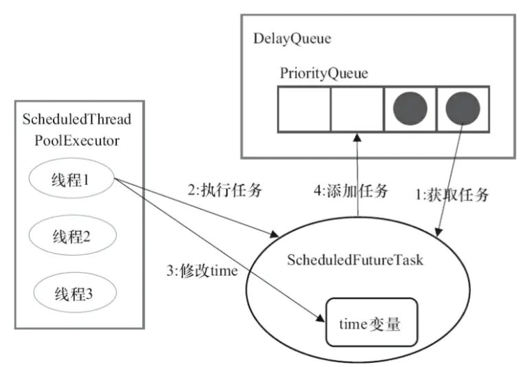 - 步骤3:线程1修改ScheduledFutureTask的time变量为下次被执行的时间;