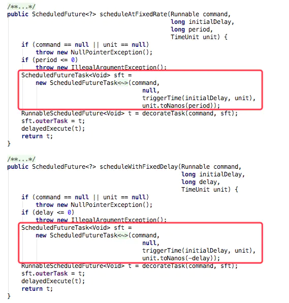 ScheduledThreadPoolExecutor中最常用的任务提交的方法有两个:ScheduleAtFixedRate方法和ScheduleWithFixedDelay方法。