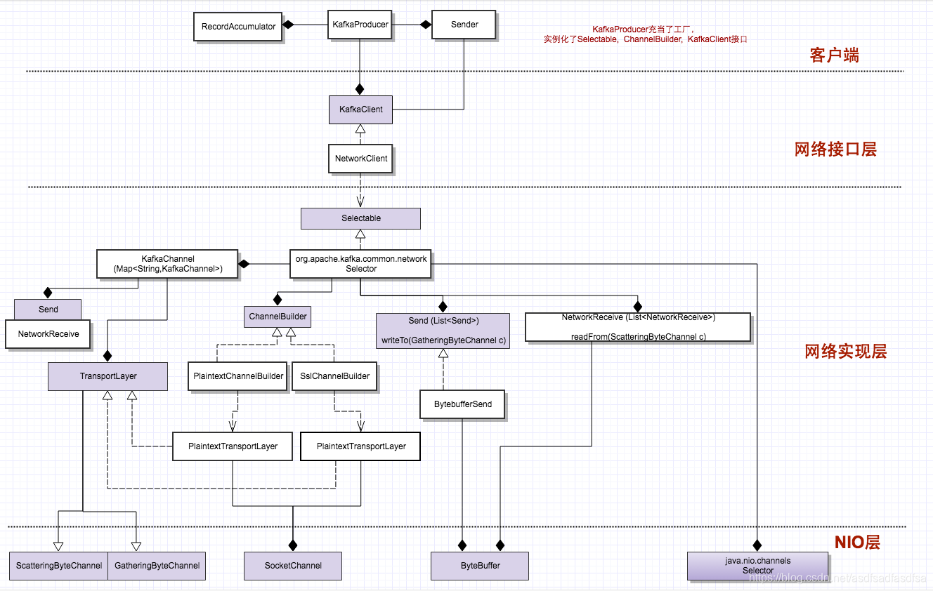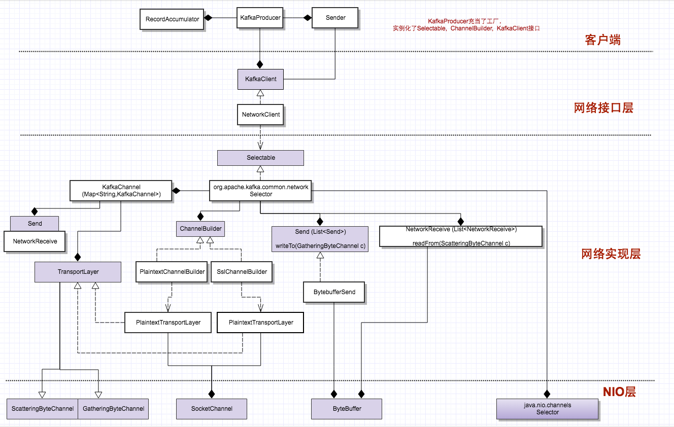 下图展示了从最上层的KafkaProducer到最底层的Java NIO的构建层次关系: