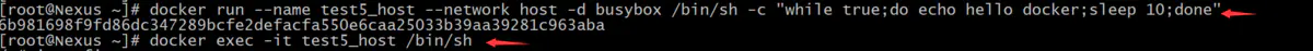 docker run --name test5_host --network host -d busybox /bin/sh -c "while true;do echo hello docker;sleep 10;done"