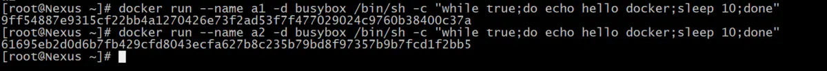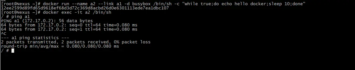 docker run --name a2 --link a1 -d busybox /bin/sh -c "while true;do echo hello docker;sleep 10;done"