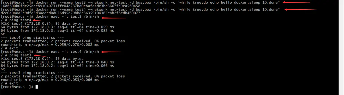 docker run --name test3 --network net-test -d busybox /bin/sh -c "while true;do echo hello docker;sleep 10;done"