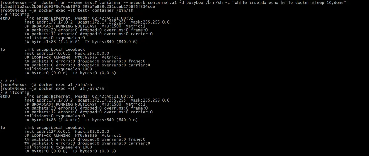 docker run --name test7_container --network container:a1 -d busybox /bin/sh -c "while true;do echo hello docker;sleep 10;done"