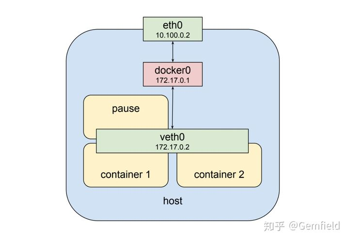 在pods的namespace中,pods的虚拟网络接口为veth0;在宿主机上,物理网络的网络接口为eth0。docker bridge作为veth0的默认网关,用于和宿主机网络的通信。