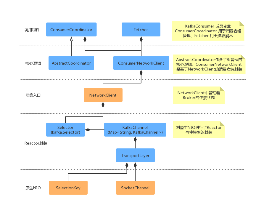 Kafka 消费者端的设计相对生产者要复杂一些,其中一个主要的原因就是,消费者组等相关概念的引入。其中包含了:ConsumerCoordinator、Fetcher、ConsumerNetworkClient 组件,其组合层级示意图如下所示: