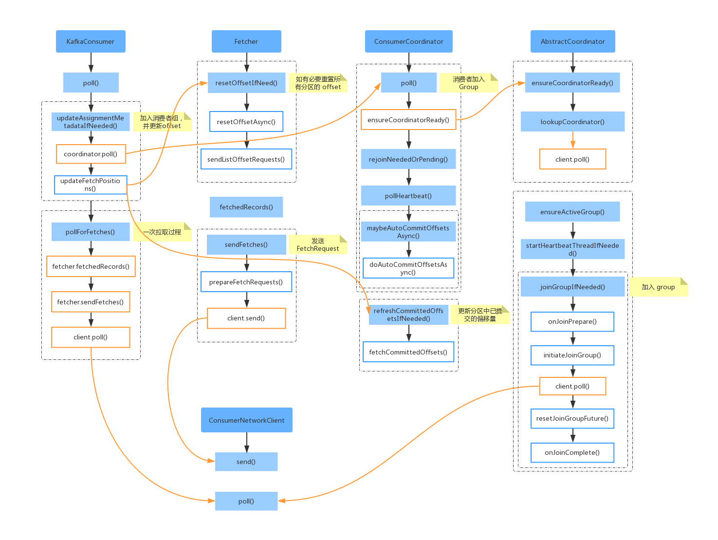 下面我们从 KafkaConsumer.poll() 为入口,看一下核心组件之间的调用关系。