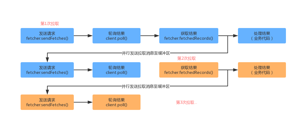 对于KafkaConsumer.poll() 不断的去拉取消息的场景,此时如果两次拉取是串行的,这个时候可能就没有充分的利用KafkaConsumer 客户端的能力。因此我们从上面的代码中可以看出,在调用完 fetcher.fetchedRecords() 获取到结果之后,会异步的再去发起请求(fetcher.sendFetches())和轮询(client.poll()),以供下次拉取立即返回结果。