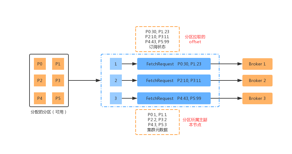 消费者 Fetcher 组件发送拉取请求的时候,也是和生产这类似,按照 Broker 的维度去发送请求。对于订阅的分区所属的节点信息,是存储在metadata 元数据信息里面的;对于消费者分区的消费位移 offset 是存储在订阅状态(SubscriptionState)中的。具体可用下面的流程图展示:
