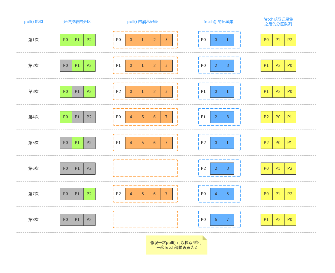 1、第一次调用 KafkaConsumer.poll() 获取消息时,允许拉取的分区是 P0、P1、P2(因为如果分区有未处理完成的记录,则不允许从服务端拉取,此时3个分区都没有未处理的消息在缓存中)。此时假设 Broker 端返回了 P0 的 0、1、2、3 四条消息,并存放在 P0 对应的缓存当中,同时返回的结果集只能给出 2 条,也就是 P0 的 0、1 。此时分区队列中的顺序还是 P0->P1->P2,因为P0 中的消息尚未处理完成,下一次 KafkaConsumer.poll() 还会继续从 P0 分区缓存中获取消息。