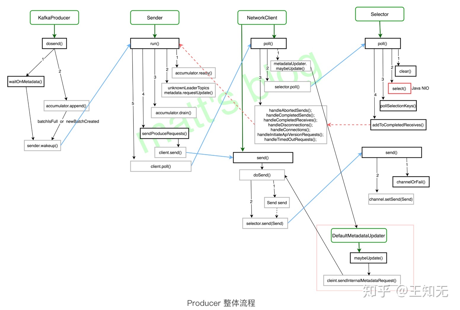 requestUpdate()方法更新 metadata,实际上还是在第一步对 tp 的遍历中,遇到没有 leader 的 tp 就将其加入到一个叫做unknownLeaderTopics的 set 中,然后会请求这个 tp 的 meta; accumulator.drain():遍历每个 leader (第一步中选出)上的所有 tp,如果该 tp 对应的 RecordBatch 不在 backoff 期间(没有重试过,或者重试了但是间隔已经达到了 retryBackoffMs ),并且加上这个 RecordBatch 其大小不超过 maxSize(一个 request 的最大限制,默认为 1MB),那么就把这个 RecordBatch 添加 list 中,最终返回的类型为Map<Integer, List<RecordBatch>>,key 为 leader.id,value 为要发送的 RecordBatch 的列表;sendProduceRequests():发送 Produce 请求,从图中,可以看出,这个方法会调用NetworkClient.send()来发送 clientRequest;NetworkClient.poll():关于 socket 的 IO 操作都是在这个方法进行的,它还是调用 Selector 进行的相应操作,而 Selector 底层则是封装的 Java NIO 的相关接口,这个下面会详细讲述。