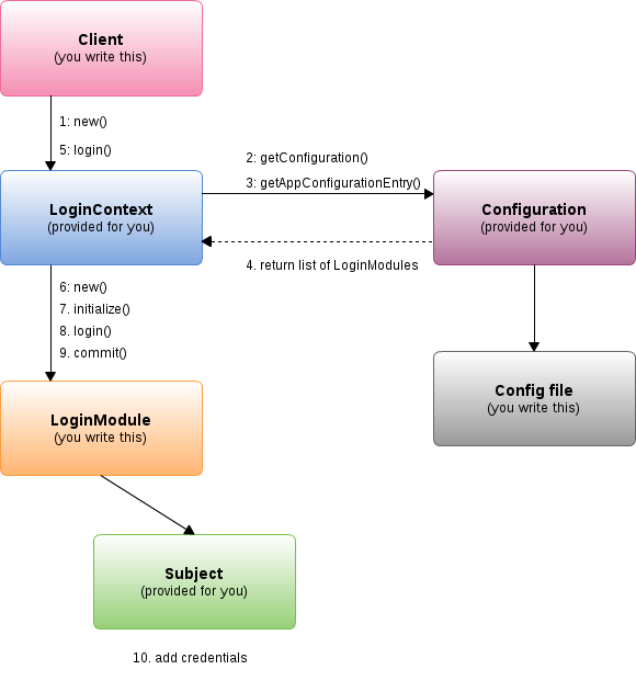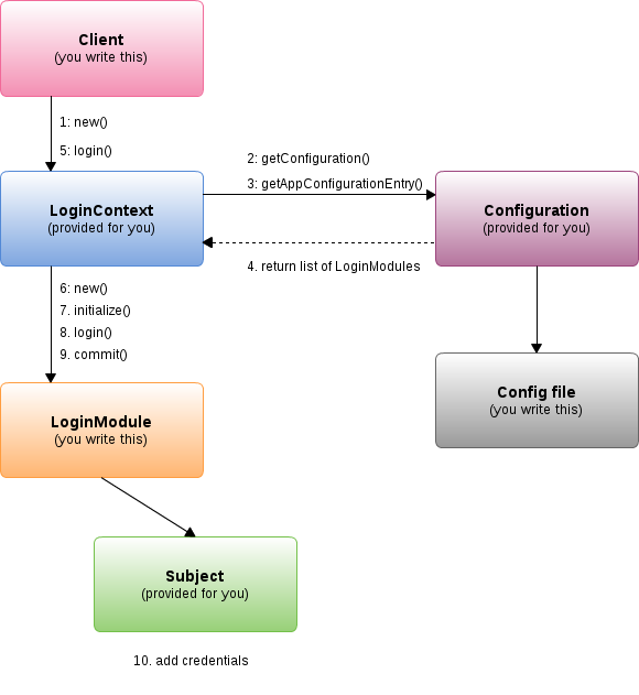 如上图所示,JAAS 认证过程分如下几个步骤: