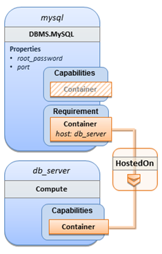 我们看到了一个新的节点类型:tosca.nodes.DBMS.MySQL。这个类型允许接收root_password和port的参数。在requirements里定义了mysql这个节点需要被安装到db_server这个节点上,这就是“关系”。如果只想表明依赖,比如说service_a依赖于service_b,也可以直接用- dependency: service_b来描述。上面文件的拓扑结构如下图: