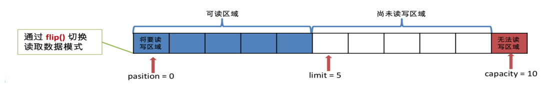此时position变成为0了,因为一开始的5,是因为这时候要写的是下标为5的数据块,而转换成读模式后,第一个读的明显是下标为0的数据块呀。limit的数值也变成了5,因为当前能读到的数据从下标为5开始就木有了,所以limit为5