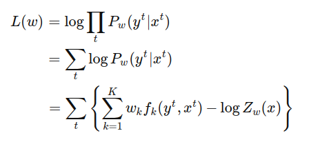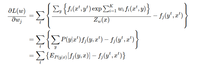 t代表所有的训练样本, 一般使用m来表示,但是上面已经把m给用了, 为了避免歧义, 我们用t来表示训练样本。我们求似然函数最大值来求解最优参数w,同时也可以对似然函数加负号,通过求解最小值来求最优的w。这里我们与CRF++保持一致,将似然函数取负号,再对wj求导,推导如下: