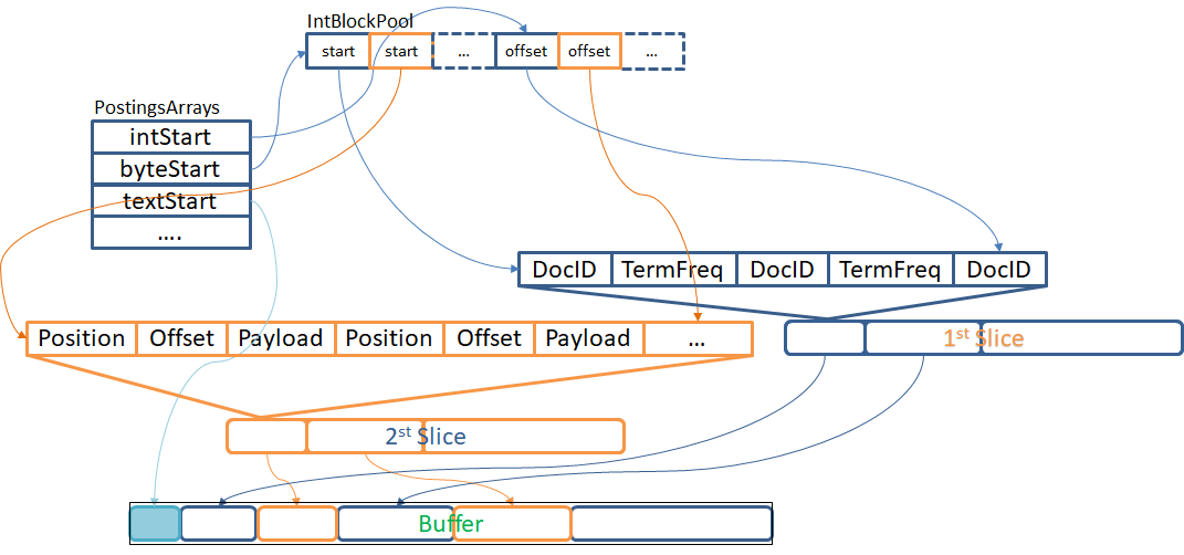 为什么byteStart和intStart需要先指向IntBlockPool呢? 主要是因为TermID可能对应了两条Slice链表,以TermID为索引的数组不方便存储。通过IntBlockPool可以方便处理,仅需要IntBlockPool连续两个位置,下一个位置用于存储第两个Slice链表。