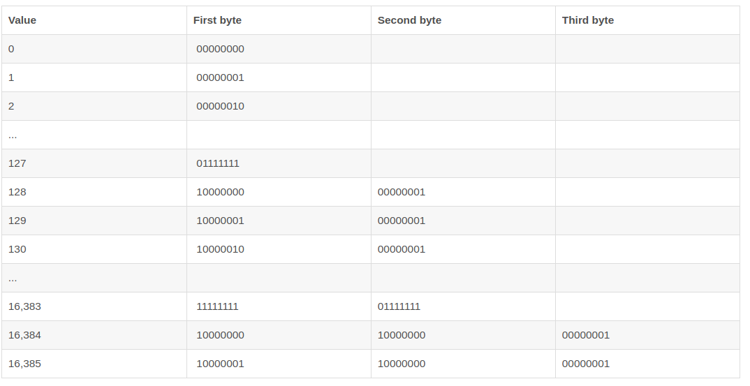该int的值为 第一个自己的后7位+第二个字节的后7位。 11111111111111(2进制) = 16383(10进制);
