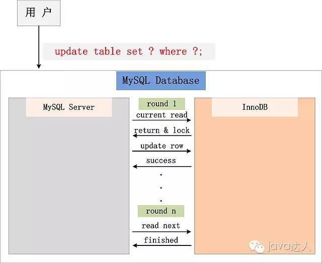 注:根据上图的交互,针对一条当前读的SQL语句,InnoDB与MySQL Server的交互,是一条一条进行的,因此,加锁也是一条一条进行的。先对一条满足条件的记录加锁,返回给MySQL Server,做一些DML操作;然后在读取下一条加锁,直至读取完毕。