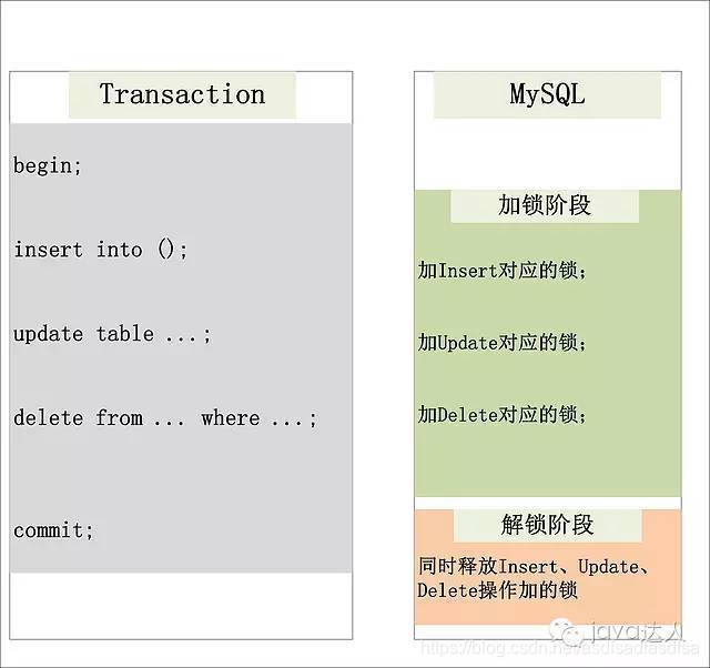 传统RDBMS加锁的一个原则,就是2PL (二阶段锁):Two-Phase Locking。相对而言,2PL比较容易理解,说的是锁操作分为两个阶段:加锁阶段与解锁阶段,并且保证加锁阶段与解锁阶段不相交。下面,仍旧以MySQL为例,来简单看看2PL在MySQL中的实现。