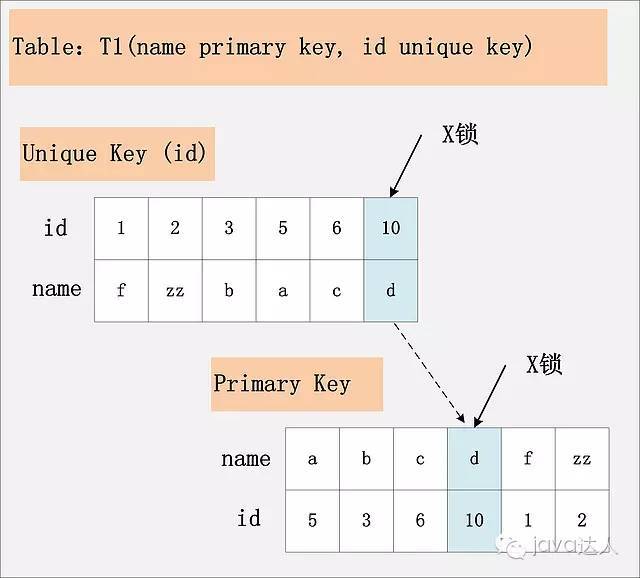 此组合中,id是unique索引,而主键是name列。此时,加锁的情况由于组合一有所不同。由于id是unique索引,因此delete语句会选择走id列的索引进行where条件的过滤,在找到id=10的记录后,首先会将unique索引上的id=10索引记录加上X锁,同时,会根据读取到的name列,回主键索引(聚簇索引),然后将聚簇索引上的name = ‘d’ 对应的主键索引项加X锁。为什么聚簇索引上的记录也要加锁?试想一下,如果并发的一个SQL,是通过主键索引来更新:update t1 set id = 100 where name = ‘d’; 此时,如果delete语句没有将主键索引上的记录加锁,那么并发的update就会感知不到delete语句的存在,违背了同一记录上的更新/删除需要串行执行的约束。