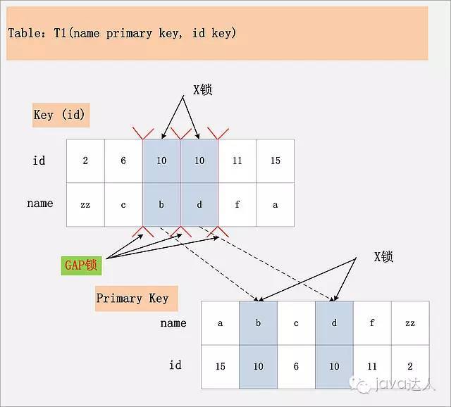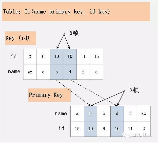 结论:若id列是unique列,其上有unique索引。那么SQL需要加两个X锁,一个对应于id unique索引上的id = 10的记录,另一把锁对应于聚簇索引上的[name=’d’,id=10]的记录。