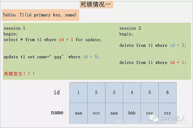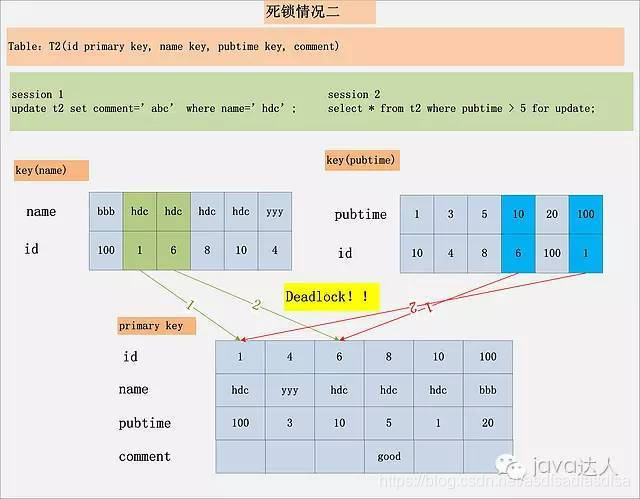 第二个用例,虽然每个Session都只有一条语句,仍旧会产生死锁。要分析这个死锁,首先必须用到本文前面提到的MySQL加锁的规则。针对Session 1,从name索引出发,读到的[hdc, 1],[hdc, 6]均满足条件,不仅会加name索引上的记录X锁,而且会加聚簇索引上的记录X锁,加锁顺序为先[1,hdc,100],后[6,hdc,10]。而Session 2,从pubtime索引出发,[10,6],[100,1]均满足过滤条件,同样也会加聚簇索引上的记录X锁,加锁顺序为[6,hdc,10],后[1,hdc,100]。发现没有,跟Session 1的加锁顺序正好相反,如果两个Session恰好都持有了第一把锁,请求加第二把锁,死锁就发生了。