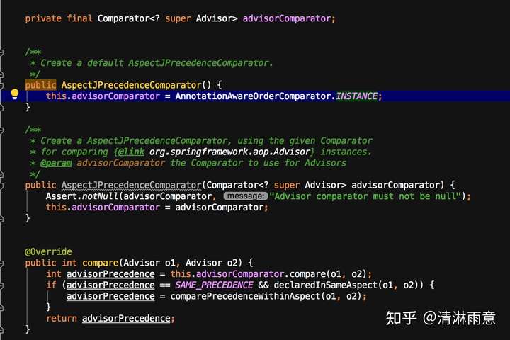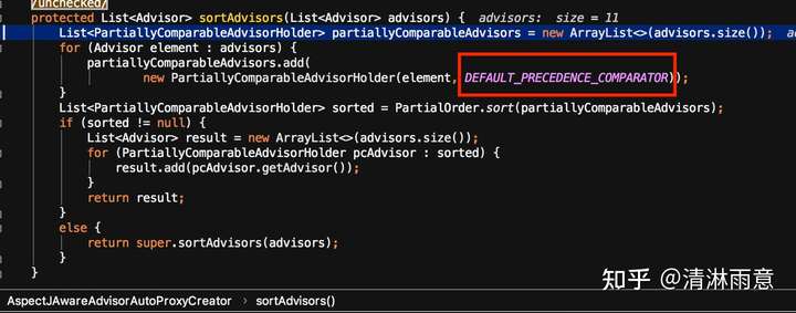 其实就是使用Comparator<Advisor> DEFAULT_PRECEDENCE_COMPARATOR = new AspectJPrecedenceComparator()来排序