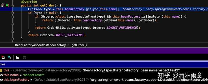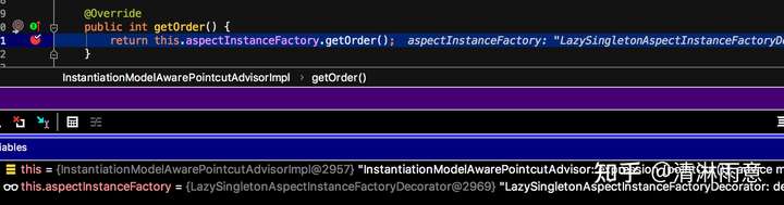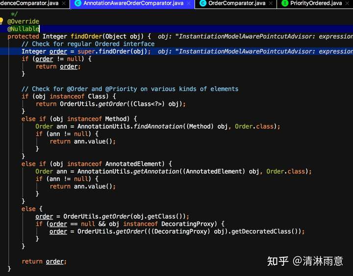 先调用super.findOrder,逻辑就是如果实现了Ordered接口,调用getOrder返回顺位,而看上图,obj实际是InstantiationModelAwarePointcutAdvisorImpl增强实现类,而该类实现了Ordered接口
