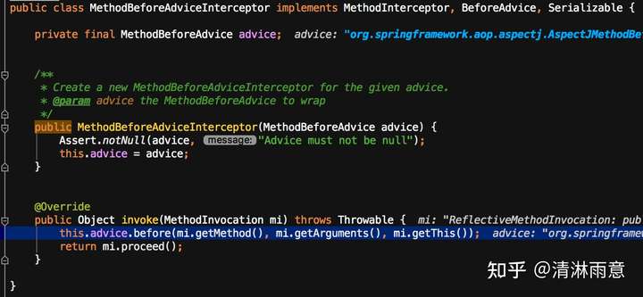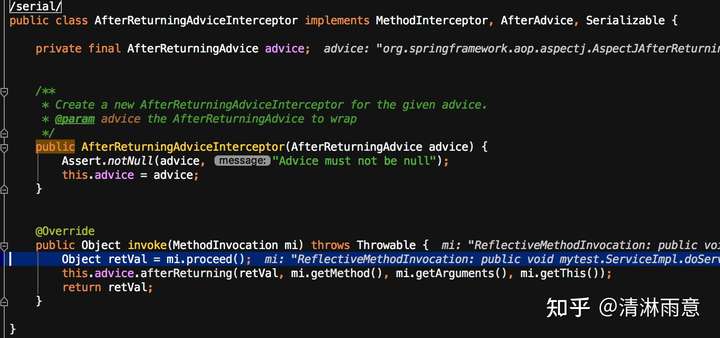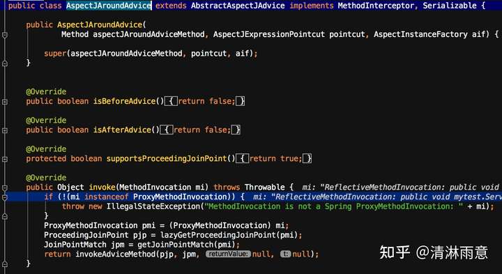 这里和之前的逻辑不太一样,没有执行mi.proceed()继续调用增强链,而是直接调用注解对应方法,但其实这行代码就在我们的业务代码中