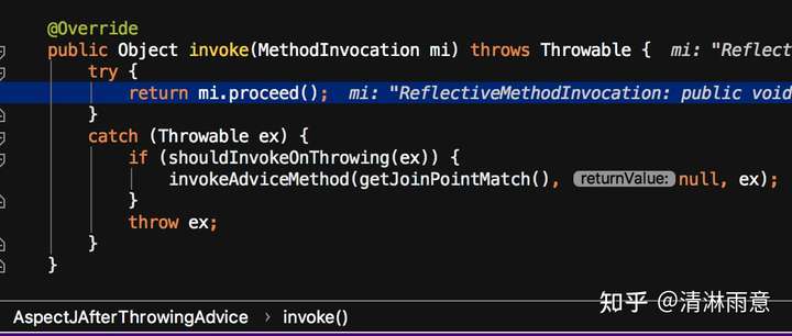 可以看到又执行了传参对象的proceed方法,即继续调用之前的方法去执行下个增强方法,但是加了一个try catch,所以如果有报错,会先判断异常类型是否匹配@AfterThrowing注解的throwing属性值,再反射调用@AfterThrowing注解对应的方法
