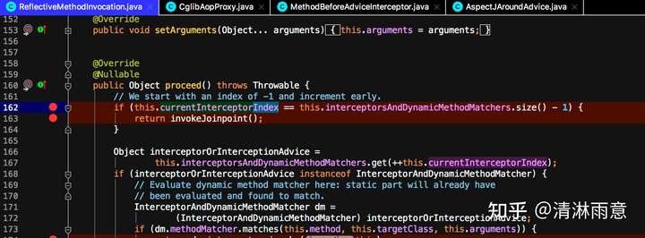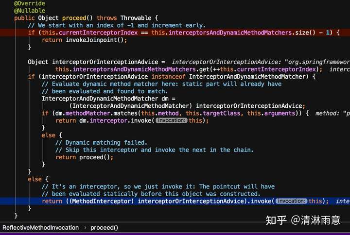 逻辑就是对增强方法list(上图中的interceptorsAndDynamicMethodMatchers)依次执行,根据上面排序的结果,一个个来解析